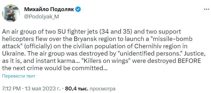 «Авиагруппа в составе двух истребителей Су (34 и 35) и двух вертолетов поддержки пролетела над Брянской областью для нанесения "ракетно-бомбового удара" (официально) по гражданскому населению Черниговской области Украины.