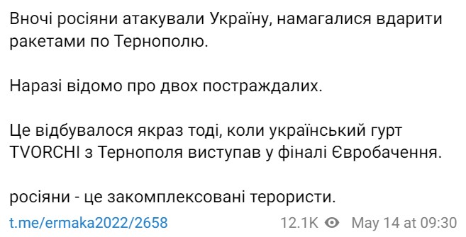 Глава Офиса президента Андрей Ермак публикует фото последствий нового ракетного удара по Тернополю.
