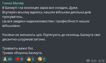 Командующий Сухопутными войсками ВСУ Александр Сырский заявил, что "мы сражаемся меньшим ресурсом, чем враг", тем не менее, продвижение войск на Бахмутском направлении - "первый успех наступательных действий" в ходе операции по обороне города.