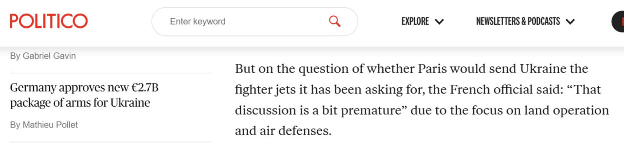 "На вопрос о том, отправит ли Париж Украине истребители, о которых он (Зеленский - Ред.) просил, французский чиновник сказал: "Это обсуждение немного преждевременно" из-за сосредоточения внимания на наземных операциях и противовоздушной обороне", - говорится в статье.