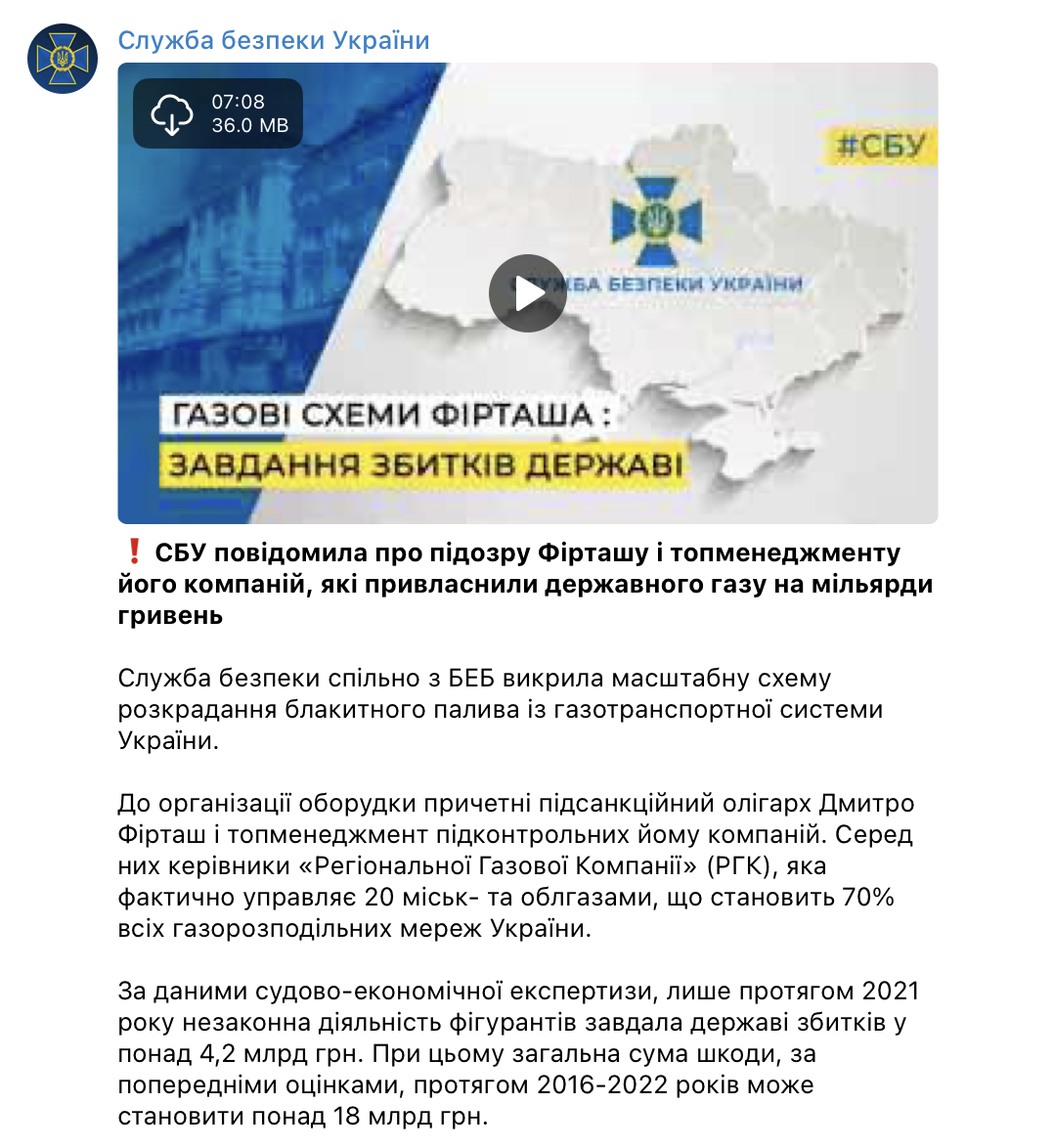 "СБУ сообщила о подозрении Фирташу и топ-менеджменту его компаний. Служба безопасности совместно с БЭБ разоблачила масштабную схему хищения голубого топлива из газотранспортной системы Украины.