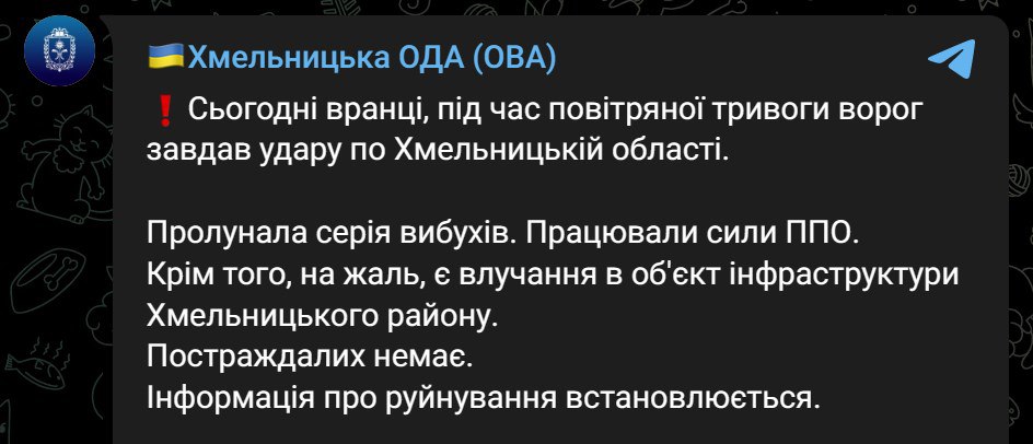 "К сожалению, есть попадание в объект инфраструктуры Хмельницкого района. Пострадавших нет. Информация о разрушении устанавливается", - говорится в сообщении.