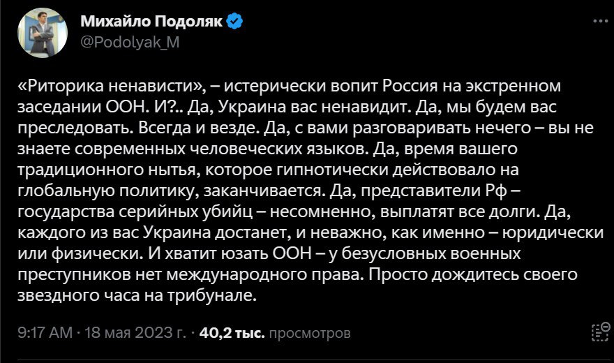 "Риторика ненависти", – истерически вопит Россия на экстренном заседании ООН. И?.. Да, Украина вас ненавидит. Да, мы будем вас преследовать. Всегда и везде. Да, с вами разговаривать нечего – вы не знаете современных человеческих языков. Да, время вашего традиционного нытья, которое гипнотически действовало на глобальную политику, заканчивается. Да, представители Рф – государства серийных убийц – несомненно, выплатят все долги. Да, каждого из вас Украина достанет, и неважно, как именно – юридически или физически. И хватит юзать ООН – у безусловных военных преступников нет международного права. Просто дождитесь своего звездного часа на трибунале", - написал Подоляк в Twitter.