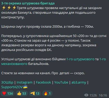 Отметим, сегодня 3-я штурмовая бригада ВСУ заявила о продвижении на 700 метров на западе Бахмута.
