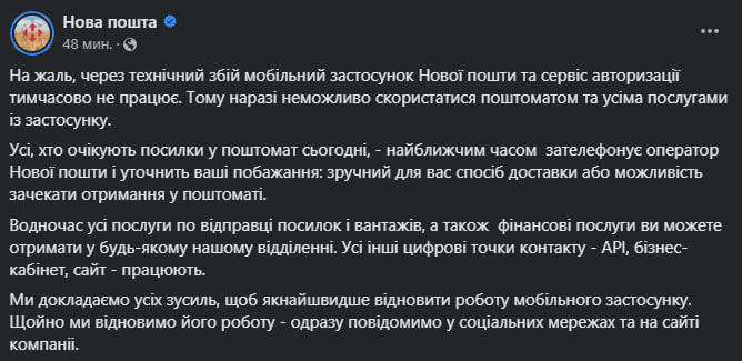 В мобильном приложении "Новой почты" произошел сбой. Ограничен доступ к почтоматам и услугам