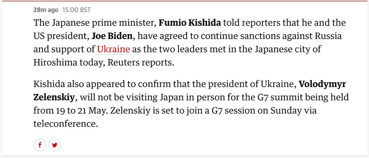 Зеленский не приедет на саммит G7 в Хиросиме - премьер Японии