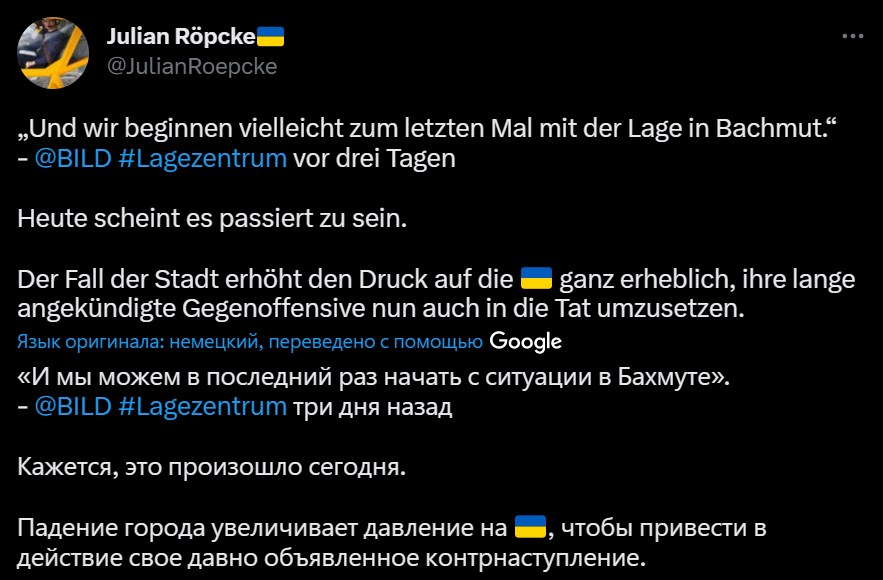 "Падение города увеличивает давление на Украину, чтобы привести в действие свое давно объявленное контрнаступление", - заявил журналист Bild Юлиан Рёпке, который процитировал свою недавнюю статью о скорой потере Бахмута ВСУ.