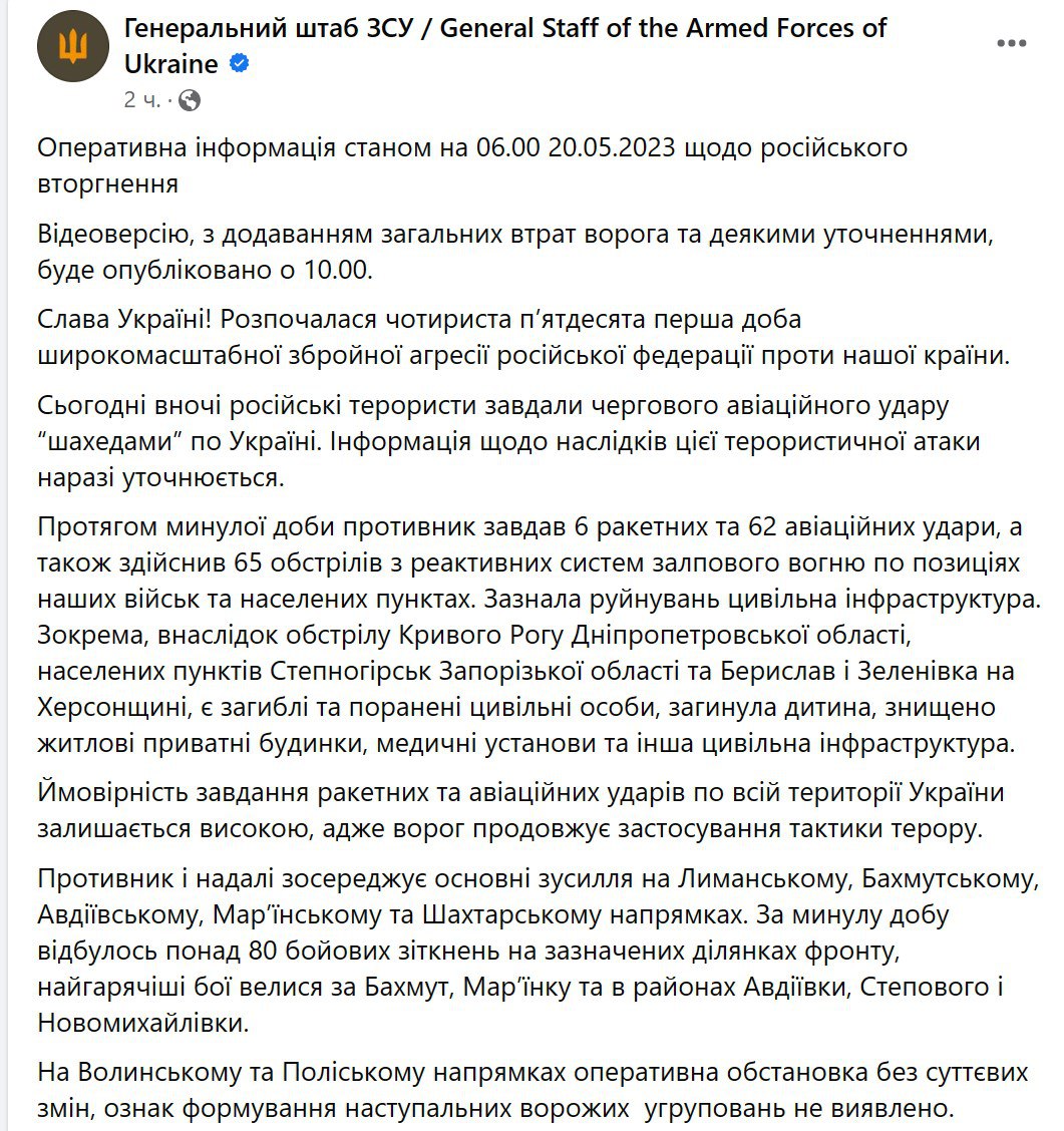 В субботу, 20 мая, Генштаб Вооруженных сил Украины опубликовал утреннюю сводку с фронта.