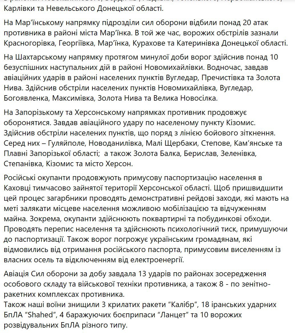 - Отражено более 20 атак противника в районе Марьинки. Южнее россияне совершили более 10 атак в районе Новомихайловки.
