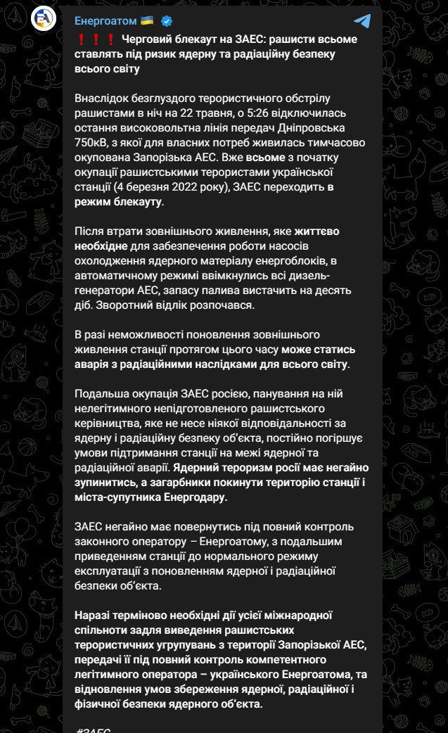 Запорожскую АЭС ночью 22 мая обстреляли российские военные, это привело к отключению последней высоковольтной линии передач, которая вела к станции.