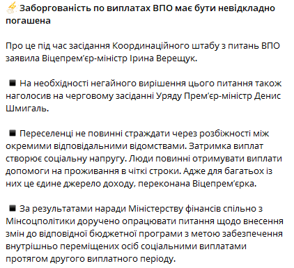 "Переселенцы не должны страдать из-за разногласий между отдельными ответственными ведомствами. Задержка выплат создает социальное напряжение. Люди должны получать выплаты пособия на проживание в четкие сроки. Ведь для многих из них это единственный источник дохода", - заявила вице-премьер Верещук во время заседания Координационного штаба по вопросам ВПЛ.