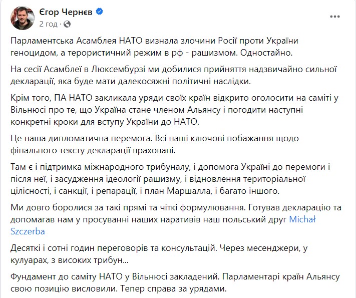 "ПА НАТО призвала правительства своих стран открыто объявить на самите в Вильнюсе о том, что Украина станет членом Альянса и согласовать следующие конкретные шаги для вступления Украина в НАТО", - написал Чернев.