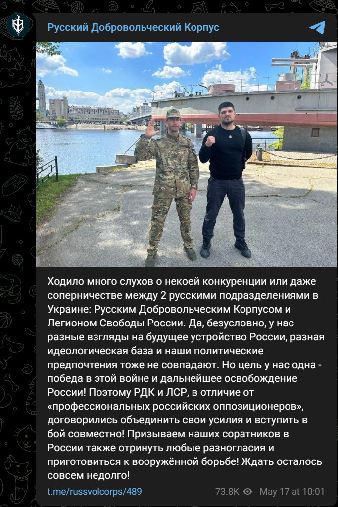 В этом контексте интересно, что 17 мая РДК и ЛСР опубликовали в Киеве совместное фото своих лидеров, уже упомянутого Капустина и представляющего Легион бойца с позывным "Цезарь" (настоящее имя - Максимилиан Андронников, по данным российских оппозиционных СМИ, в РФ он входил в право-монархическую организацию "Имперский легион").