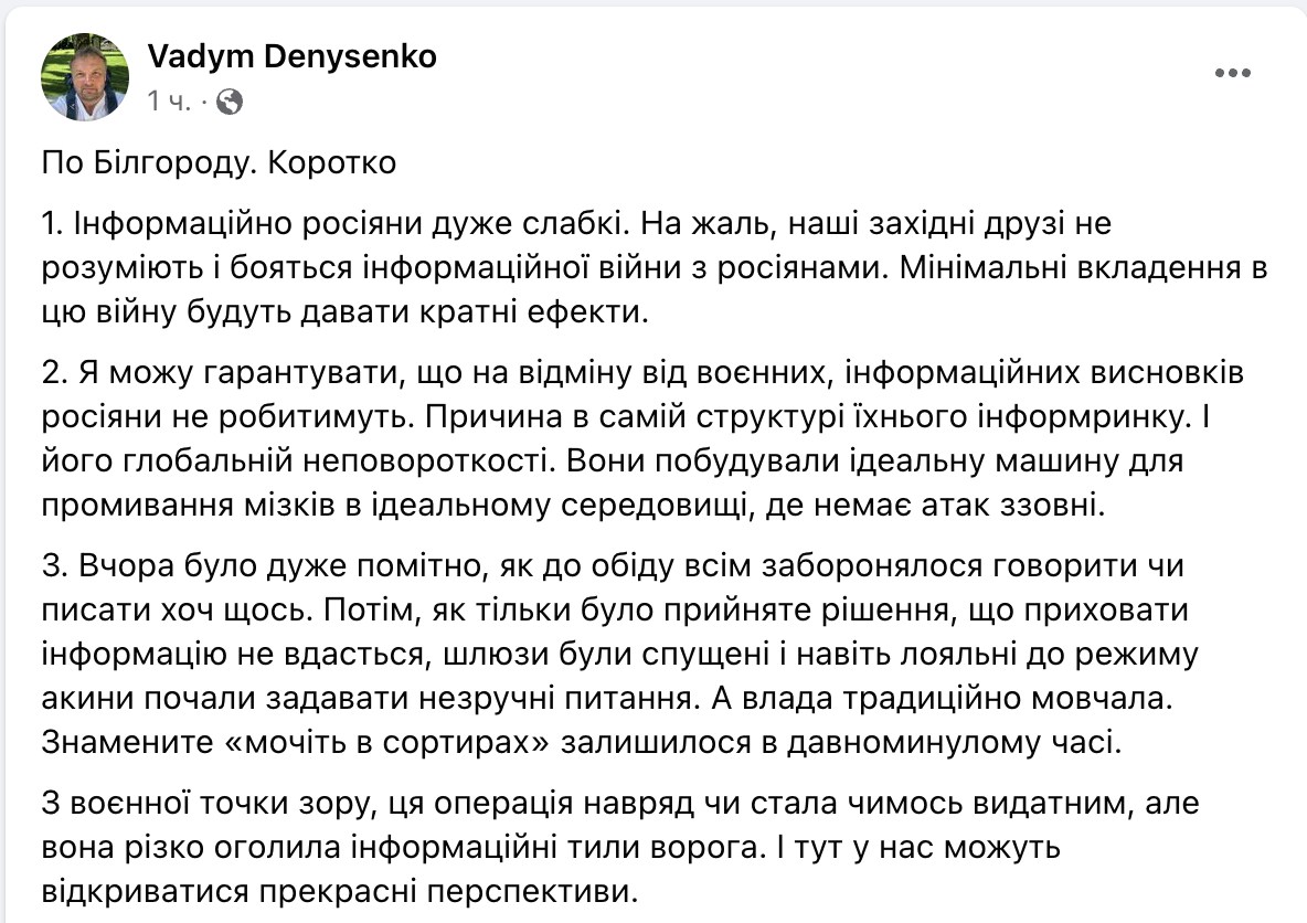 Руководитель "Украинского института будущего" Вадим Денисенко подводит итоги вчерашнего рейда "партизан" в Белгородскую область.