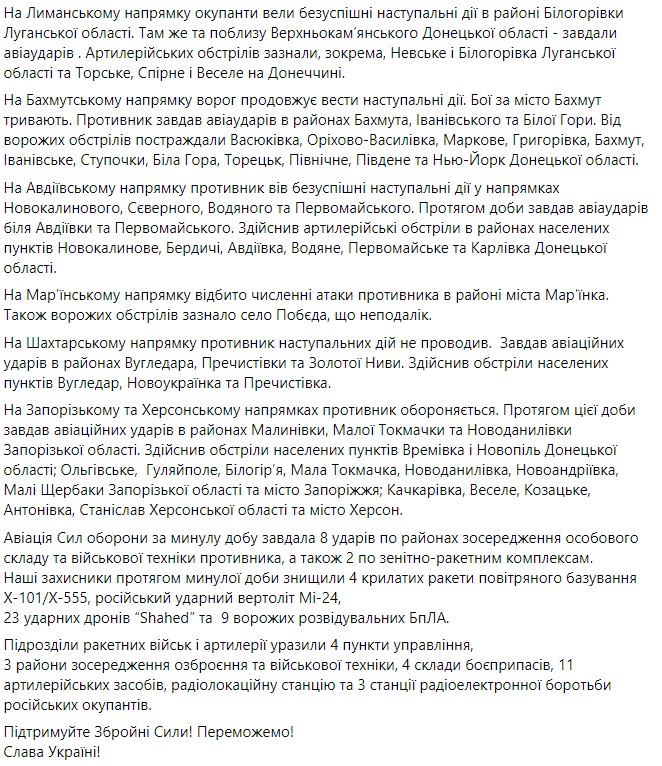 За минувшие сутки произошло более 30 боевых столкновений на фронте. Основные усилия россиян были сосредоточены на Купянском, Лиманском, Бахмутском, Авдеевском и Марьинском направлениях.