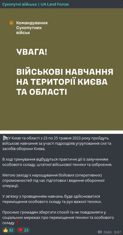 В Киеве и области с сегодняшнего дня, 23 мая, и по 25 мая пройдут военные учения с участием подразделений группировки сил и средств обороны столицы.