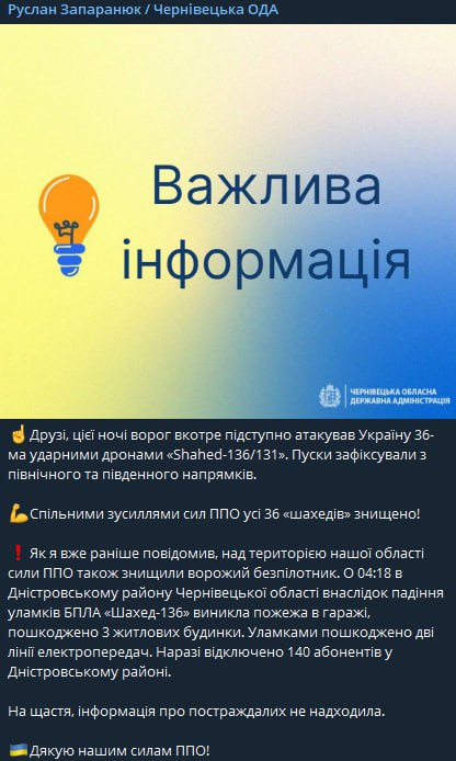 По данным главы Черновецкой ОВА Руслана Запаранюка, пуски зафиксировали по северному и южному направлениям. Падение обломков БПЛА "Шахед-136" в Днестровском районе Черновицкой области произошло в 04:18.