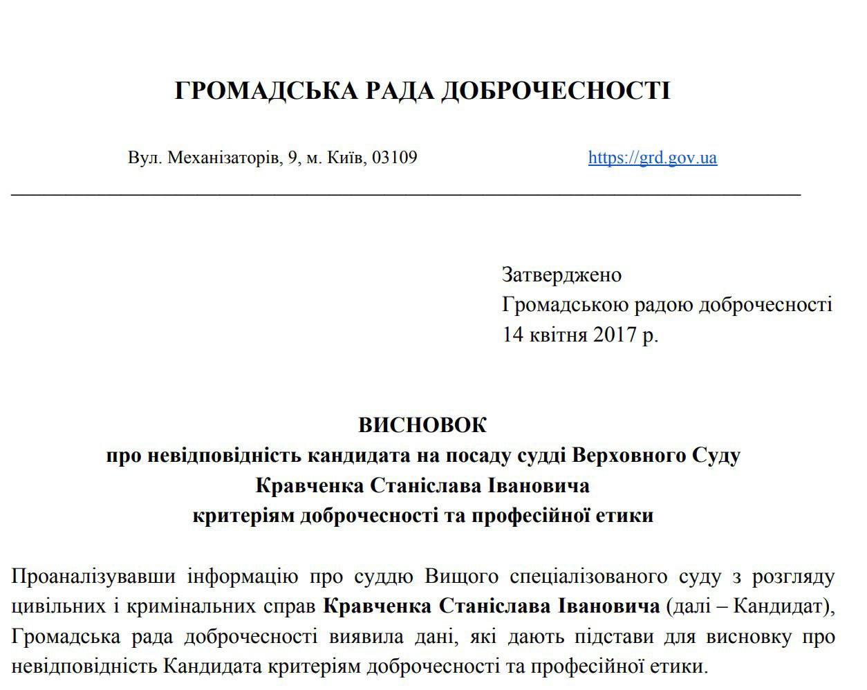 Накануне назначения в Кассационный уголовный суд в 2017 году по поводу Кравченко возникли претензии у Общественного совета добропорядочности: там утверждали, что в своих декларациях он не указал участок земли на 900 квадратных метров, которым де-факто владел с 2002 года. Участок находится в городе Козелец Черниговской области.