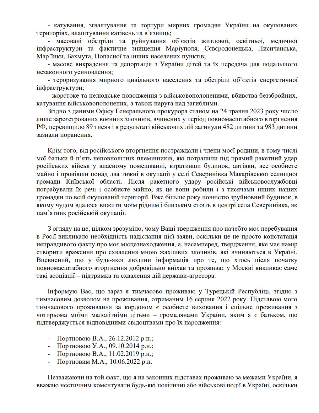 Андрей Портнов заявляет, что сейчас живет в Турецкой Республике согласно временному разрешению на проживание, полученному 16 августа 2022 года. Основанием для временного проживания за границей является личное воспитание и совместное проживание с четырьмя малолетними детьми – гражданами Украины (2012, 2014, 2019, 2022 годов рождения).