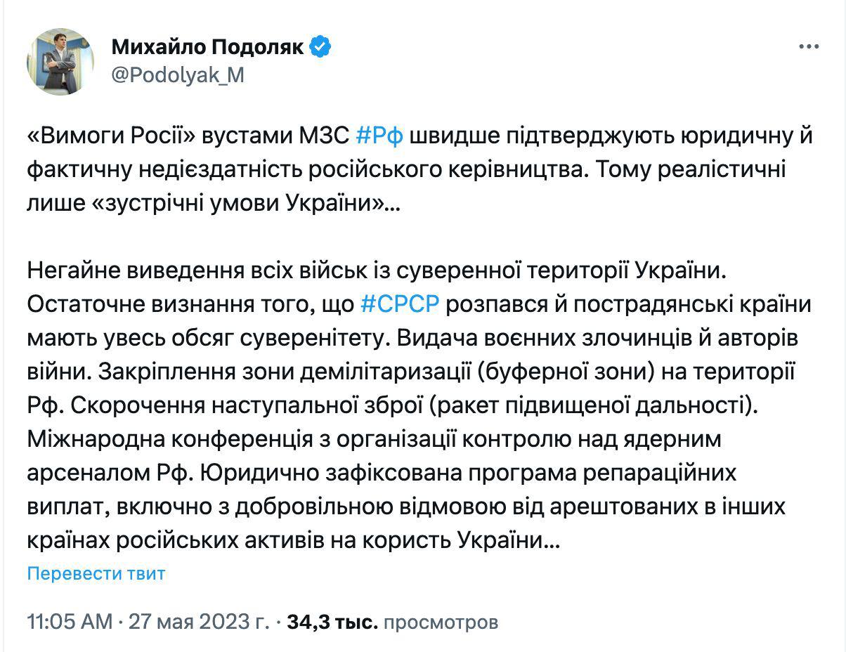 Подоляк считает реалистичными только "встречные условия Украины" и озвучивает их: