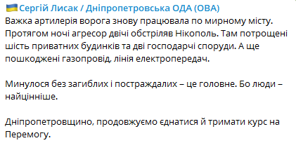 Никополь Днепропетровской области враг обстрелял дважды за ночь из тяжелой артиллерии. В городе разбиты шесть частных домов и две хозяйственные постройки, поврежден газопровод, линия электропередач.