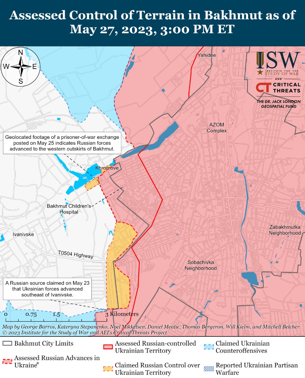 Официально диспозиция с обоих сторон не поменялась: россияне утверждают, что они полностью контролируют Бахмут, Украина утраты города не признает, заявляя, что продолжает удерживать позиции на юго-западе города.