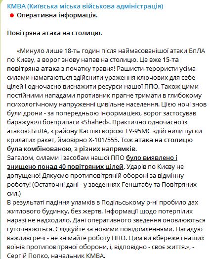 Всего силами ПВО было выявлено и уничтожено более 40 воздушных целей. Удары по Киеву не допущены.