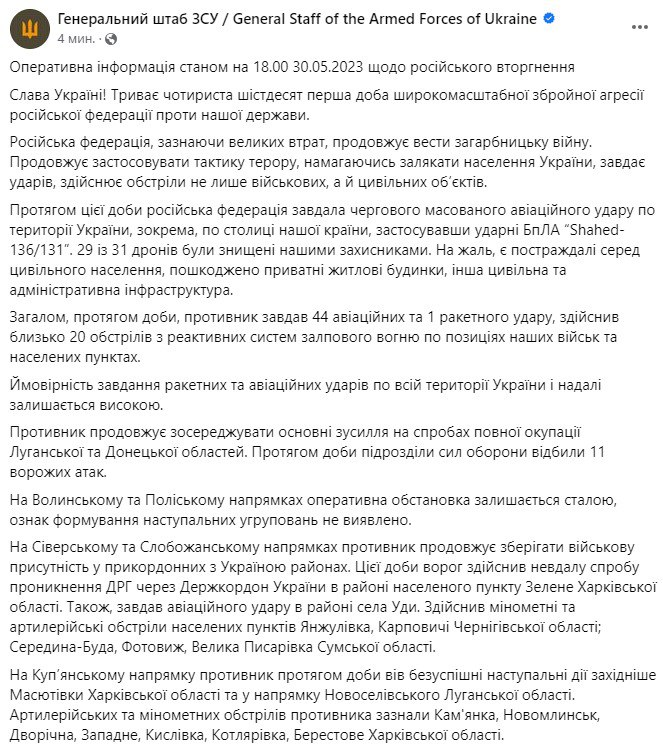 Генштаб Вооруженных сил Украины опубликовал вечернюю сводку с фронта за минувшие сутки 30 мая.