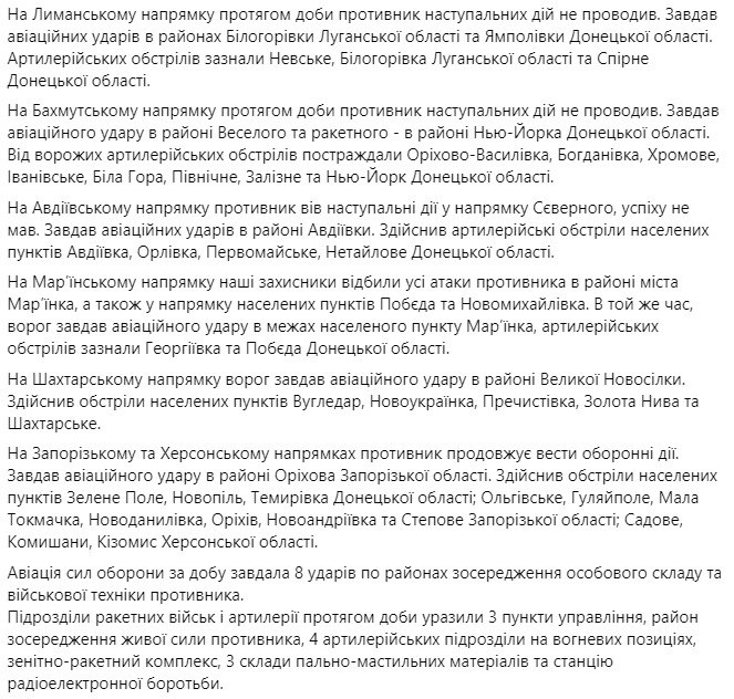 3. На Волынском, Полесском, Северском, Лиманском, Бахмутском, Шахтерском, Запорожском и Херсонском направлениях обстановка без существенных изменений.