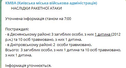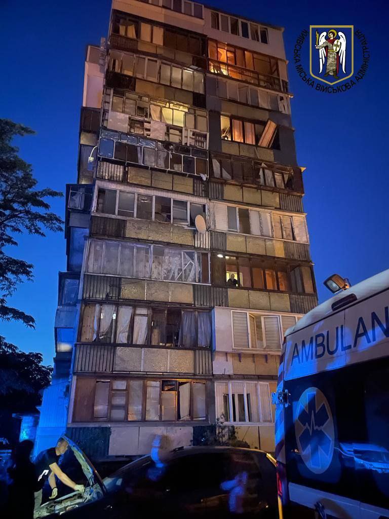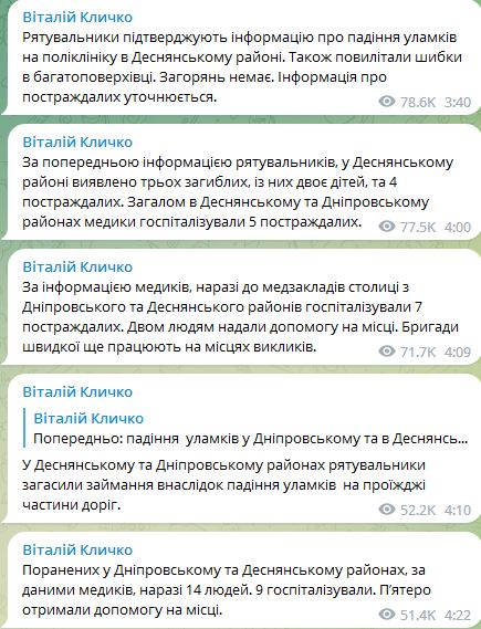 Деснянский район: в результате падения обломков ракеты повреждено здание детской поликлиники и близлежащие жилые дома. Во время ликвидации последствий были травмированы 10 человек, среди которых 1 ребенок, а также обнаружены тела 3 человек.