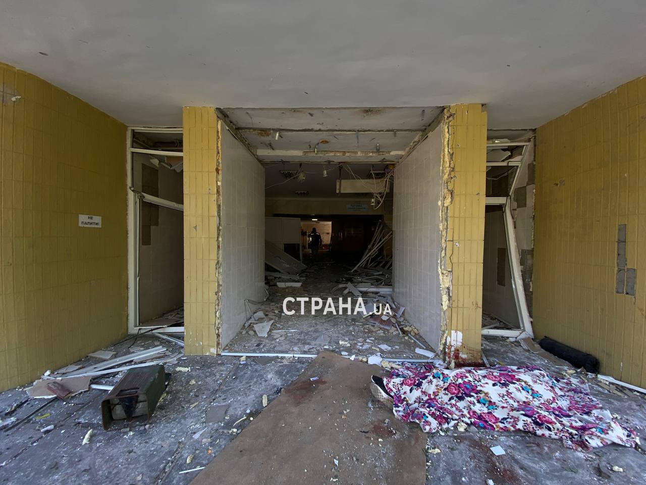 10.10 Центральные двери в поликлинику в Деснянском районе Киева, где от обломков погибли трое человек, оказались выбиты ударной волной, сообщает корреспондент "Страны".