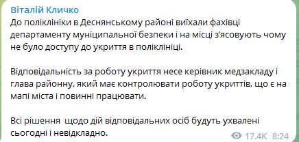 08.30 В поликлинику в Деснянском районе Киева выехали специалисты департамента муниципальной безопасности и на месте выясняют, почему не было доступа к укрытию в поликлинике.