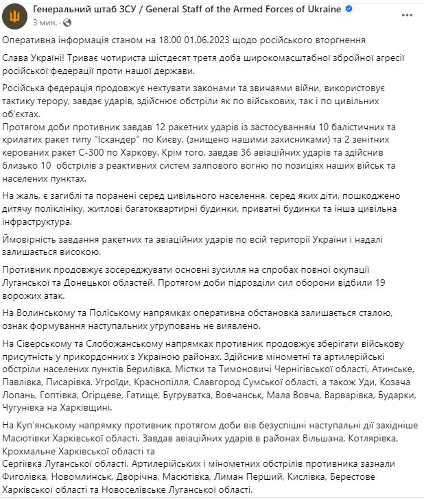 В четверг, 1 июня, в Украине продолжается уже 463-й день войны с Россией.