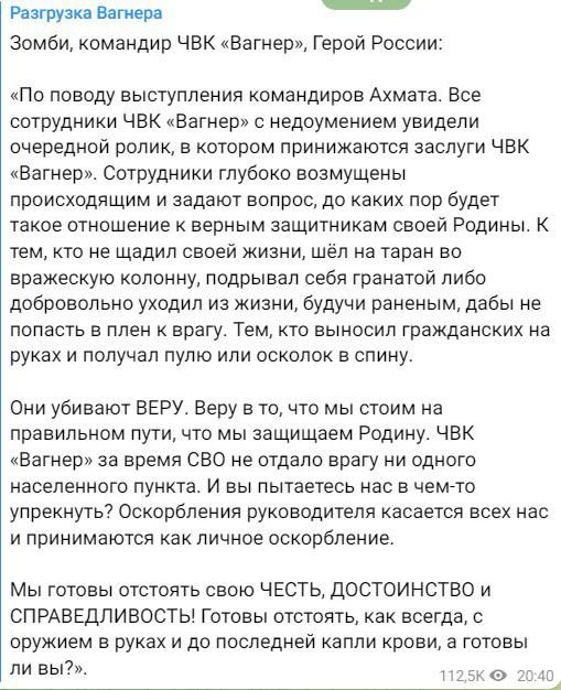 «Зомби» сказал, что в споре с кадыровцами «вагнеровцы» готовы отстоять «свою честь, достоинство и справедливость с оружием в руках и до последней капли крови».