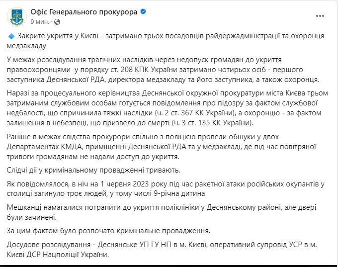 21.27 В ходе расследования гибели людей из-за недопуска граждан к укрытию в Киеве правоохранители задержали четырех человек – первого заместителя Деснянской РГА, директора медучреждения и его заместителя, а также охранника.