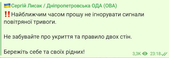 23.23 Глава Днепропетровской области Сергей Лысак призывает жителей региона не игнорировать сигналы тревоги.