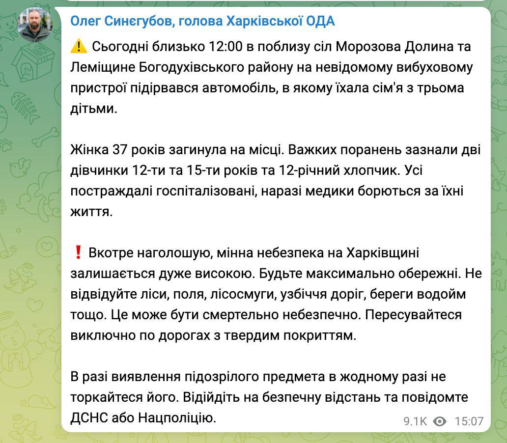 "Сегодня около 12:00 вблизи деревень Морозова Долина и Лемищино Богодуховского района на неизвестном взрывном устройстве взорвался автомобиль, в котором ехала семья с тремя детьми. Женщина 37 лет скончалась на месте. Тяжелые ранения получили две девочки 12 и 15 лет и 12-летний мальчик. Все пострадавшие госпитализированы, медики борются за их жизнь", - сказано в посте.