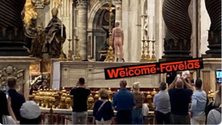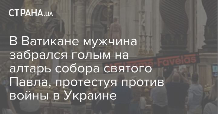 В соборе святого Петра в Ватикане мужчина выразил свой протест против войны в Украине тем, что забрался на главный алтарь храма практически абсолютно обнаженным. На нем были только носки и обувь.