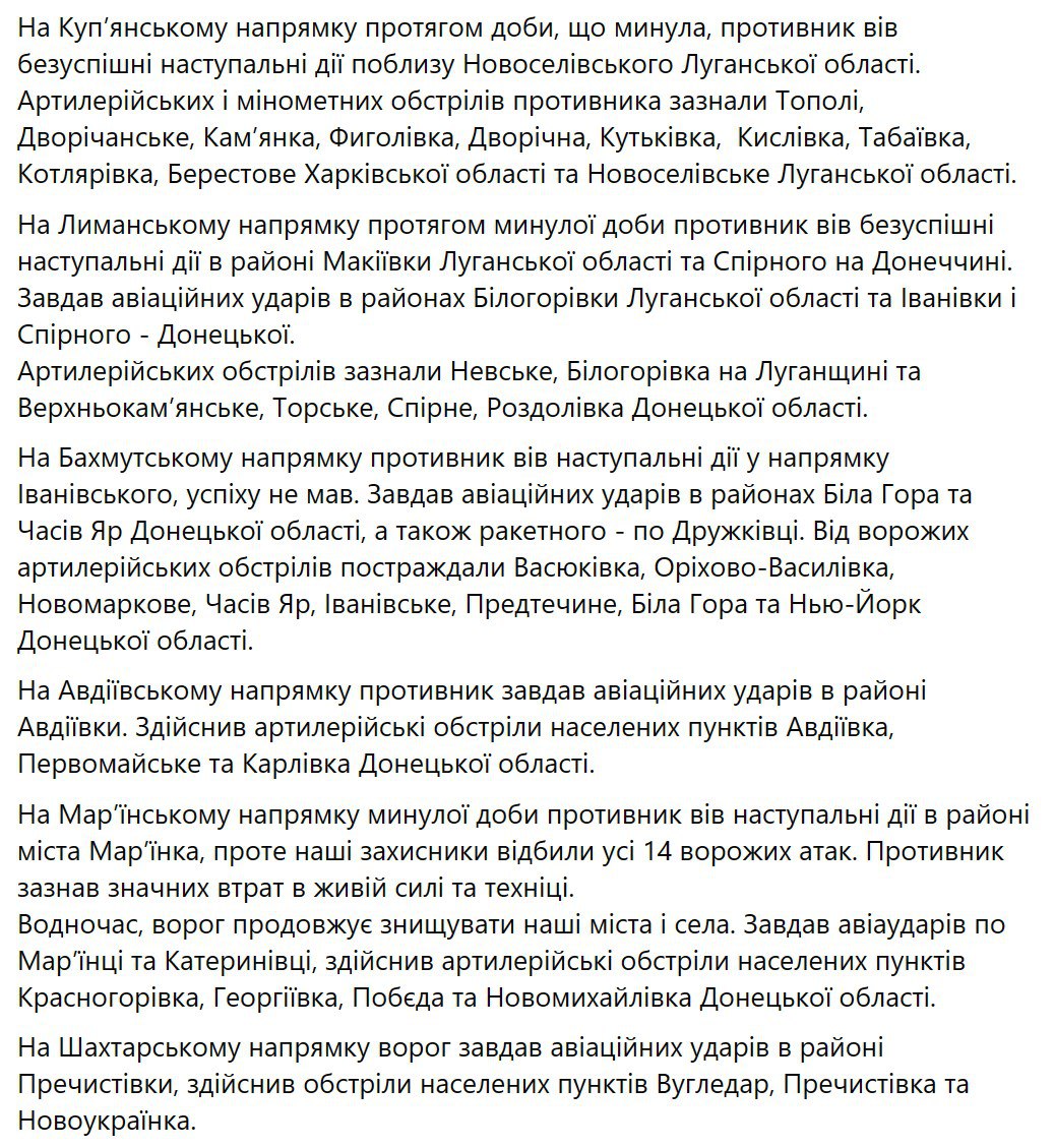 Бои шли у Новоселовского и Макеевки Луганской области. В районе Северска россияне атаковали в районе Спорного.