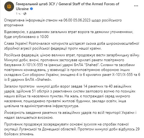 В понедельник, 5 июня, Генштаб ВСУ обнародовал сводку о ситуации на фронте.