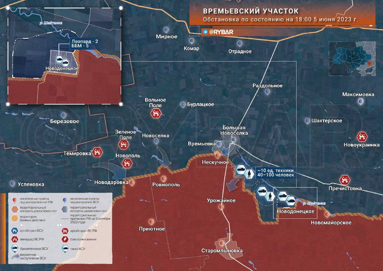 Бои, судя по официальным данным РФ, шли в районе Нескучного (Донецкая) и Новодаровки (Запорожская область). Минобороны России утверждает, что атака не удалась, и к утру 5 июня ВСУ отошли на исходные позиции.