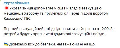 Первый эвакуационный поезд отправится из Херсона в 12:00. При необходимости будут назначены дополнительные эвакуационные поезда.