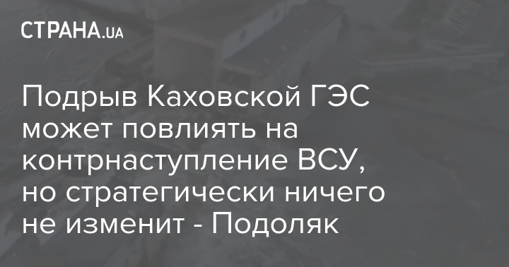 Советник главы Офиса президента Украина Михаил Подоляк заявил, что ВСУ может скорректировать свои планы контрнаступления из-за подрыва Каховской ГЭС.