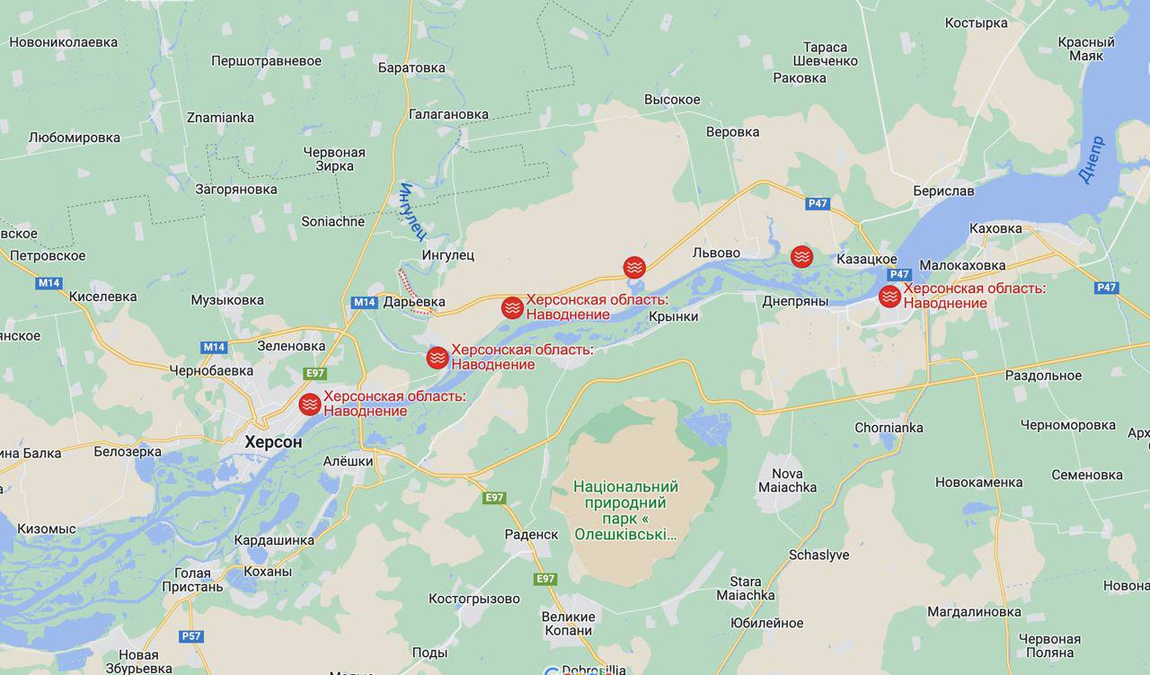 На Google-картах появились специальные отметки, сообщающие о наводнении в Херсонской области.