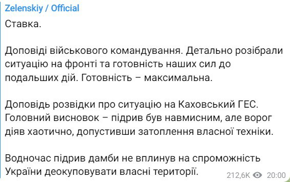 "Отчеты военного командования. Подробно разобрали ситуацию на фронте и готовность наших сил к дальнейшим действиям. Готовность – максимальная. Доклад разведки о ситуации на Каховский ГЭС. Главный вывод: подрыв был умышленным, но враг действовал хаотично, допустив затопление собственной техники. В то же время подрыв дамбы не повлиял на способность Украины деоккупировать собственные территории", – написал он в своем телеграм-канале.