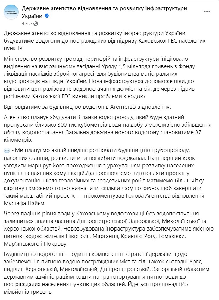 Государственное агентство восстановления и развития инфраструктуры Украины планирует построить три участка водопровода к пострадавшим от подрыва Каховской ГЭС населенным пунктам.