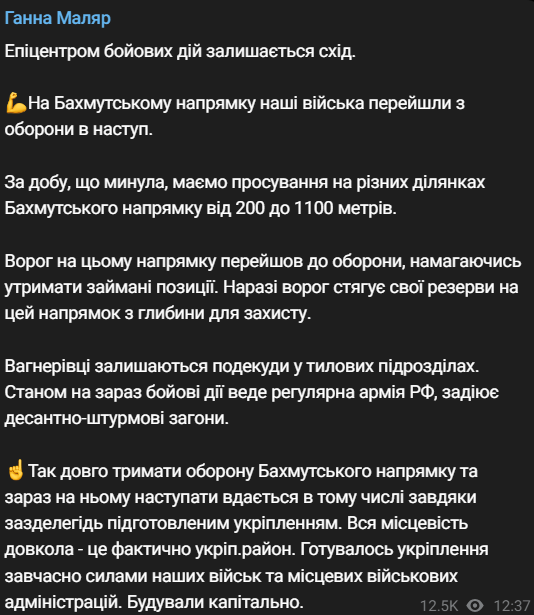 Маляр отметила, что так долго держать оборону Бахмутского направления и сейчас на нем наступать удается, в том числе, благодаря заранее подготовленным укреплениям.