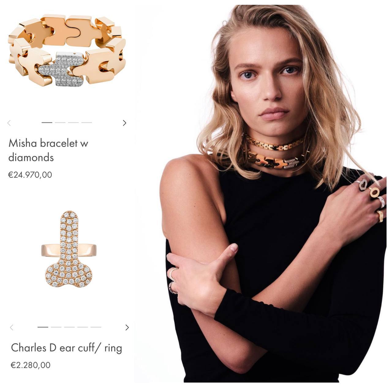 Алена Киперман (в девичестве Гайваненко) создает экстравагантные браслеты, подвески, каффы, чокеры из золота с драгоценными камнями. Самое вызывающее украшение - перстень с мужским половым органом (посыпка из бриллиантов) за €2280. А одно из самых дорогих, которое сейчас можно купить на сайте - браслет Misha (вероятно в честь супруга) - стоимостью почти €25 000.