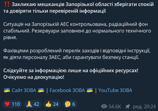 "Ситуация на Запорожской АЭС контролируется, радиационный фон стабилен. Резервуары заполнены до нормального технического уровня. Специалистами разработан перечень мероприятий и соответствующие инструкции, как действовать персоналу ЗАЭС, чтобы обеспечить безопасность станции", – сообщил Малашко в своем телеграм-канале.