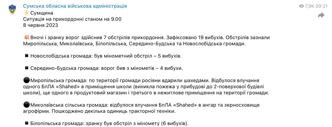 10.55 РФ атаковала "Шахидами" Сумскую область, сообщает ОВА.